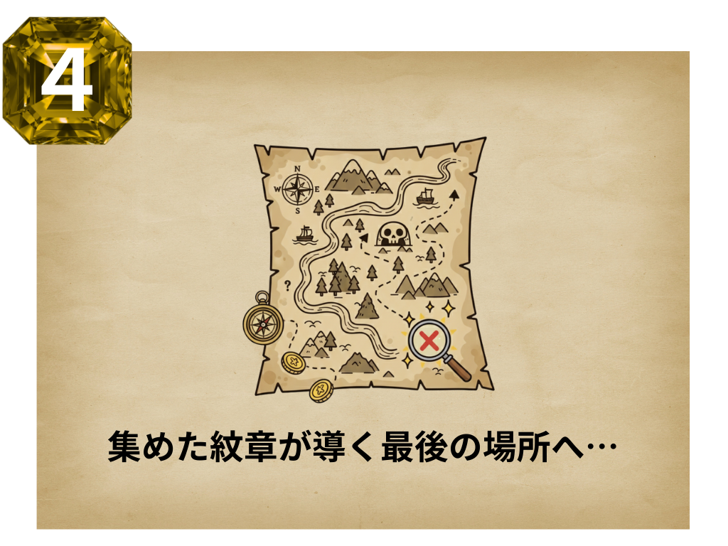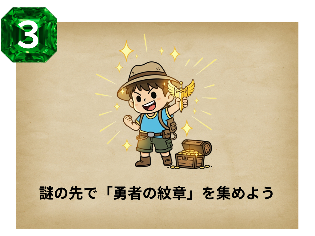 「謎を解き明かし、”大切な宝”が眠っている秘密の場所へと向かうのだ。その場所を明らかにするには、ワテラス内に置かれた”勇者の紋章”がカギを握る。まずは紋章を集めるんだ!」